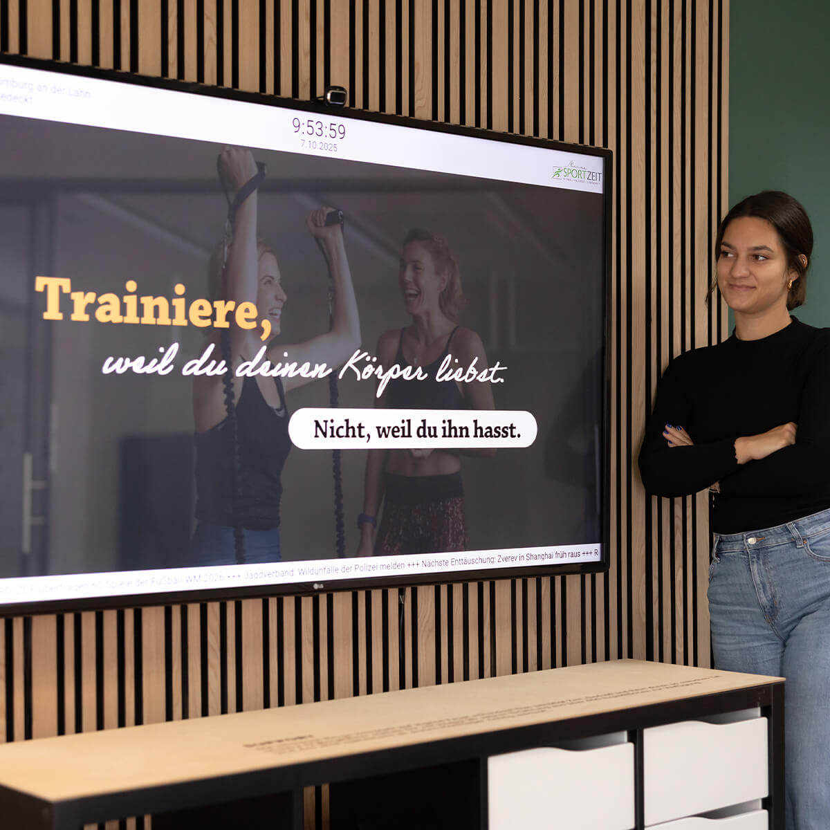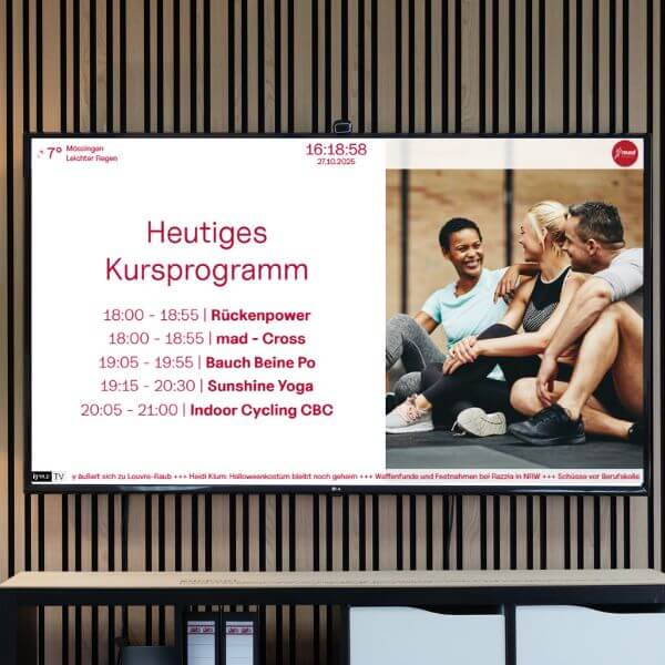 Mit igroupTV laufen Deine Inhalte vernetzt und effizient: Canva-Sync, automatische Kurspläne, Social-Feeds und Live-News – im Corporate Design, je Standort, Gerät und Zone. Gewinnwirksam und refinanzierbar mit eigenen Werbepartnern – für starke Mitgliederbindung.